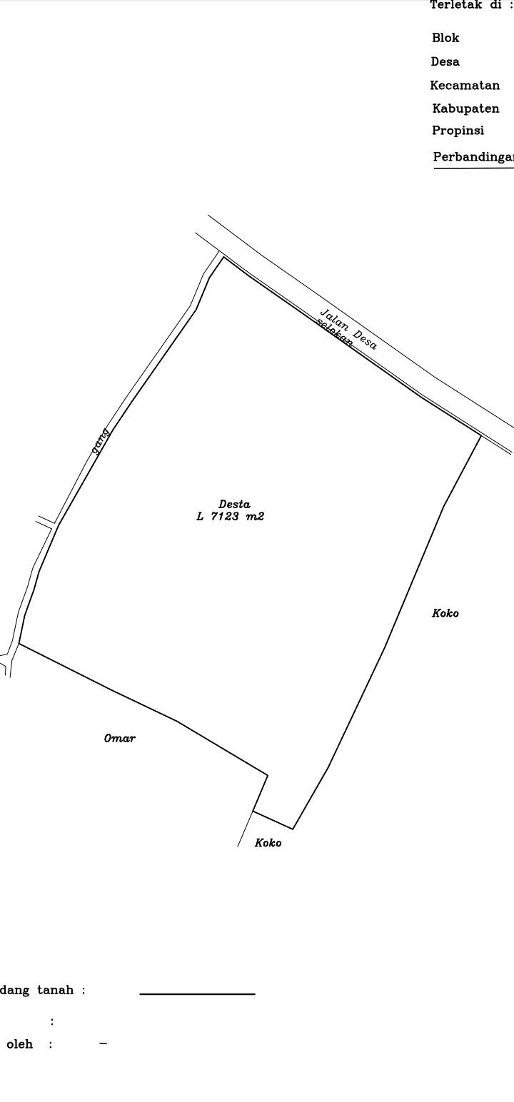 Dijual tanah darat posisi pinggir jalan dan zona kuning harga 3jt per tumbak atau 214rb per M2 dengan luas 7123m2 .